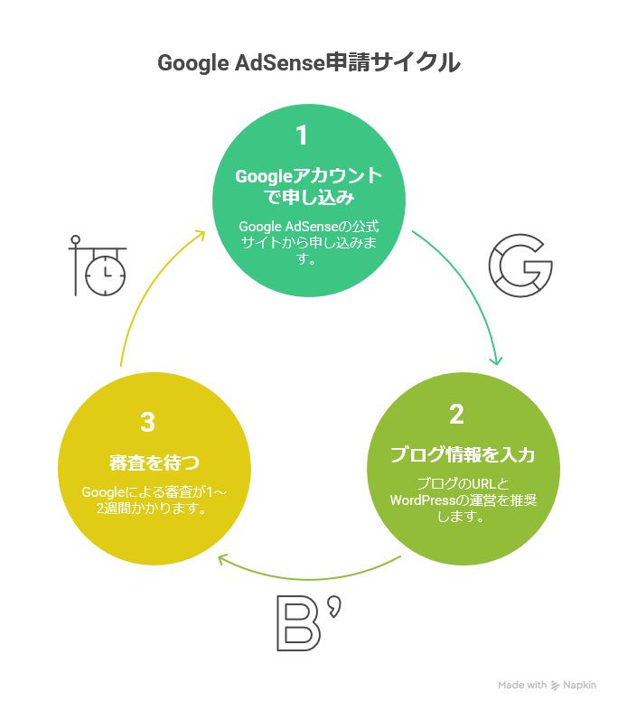 | Step 1 | Googleアカウントで申し込み | Google AdSenseの公式サイトから、ご自身のGoogleアカウントで申し込みます。 |